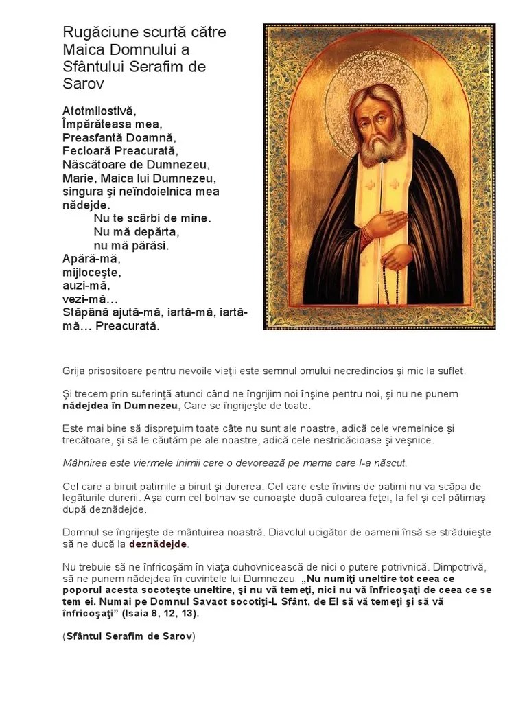 Rugăciune scurtă către maica domnului a sfântului serafim de sarov... Maica domnului va veni acum la noi. Nu mă depărta, nu mă părăsi. Rugăciunea inimii în viața sfântului cuvios serafim de sarov. Atotmilostivă, împărăteasa mea, preasfantă doamnă, fecioară preacurată, născătoare de dumnezeu, marie, maica lui dumnezeu, singura şi neîndoielnica mea nădejde. O, preasfinte cuvioase și de dumnezeu purtătorule părinte serafim, caută din slava ta cea de sus către noi cei smeriți și neputincioși, împovărați cu multe păcate, care cerem de la tine ajutor și mângâiere.